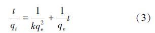 研究不同吸附时间对十八烷胺吸附效果的影响,控制十八烷胺浓度为1 mg · L-1,T=293.15 K,pH=3.5,吸附剂初始浓度为0.5 mg · L-1时取一定体积的十八烷胺溶液,并测定其浓度,考察不同吸附时间对十八烷胺的吸附效果影响,结果如图 6所示.从图中可以看出,十八烷胺的吸附率随着时间的增加而上升,并且逐渐趋于平衡的状态.在3 h 内吸附率达到平衡,表明了MHNTs吸附十八烷胺以化学吸附为主,物理吸附为辅(刘霞等,2012).为了更好的探索MHNTs对十八烷胺的吸附动力学机理,应用动力学准二级方程式对数据进行分析.方程式如下(卞维柏等,2014):