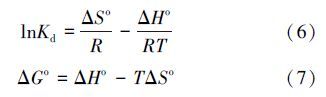 十八烷胺在磁性埃洛石上的吸附相关热力学函数ΔH0,ΔG0,ΔS0,可以由在不同温度下的吸附等温线得到,计算公式见式(6)、式(7):