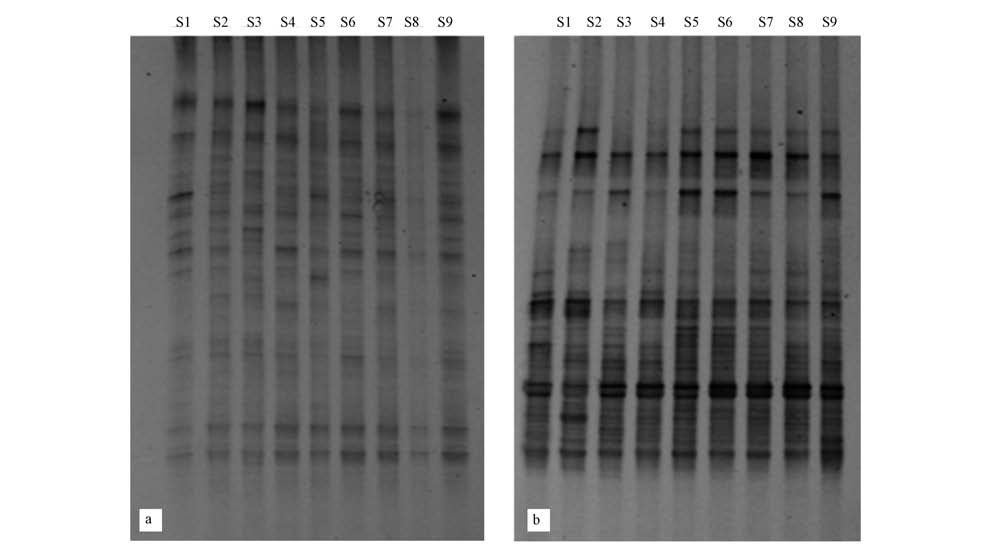 | 图2 大亚湾海域浮游细菌16S rDNA V3区DNA图谱(a. 2010年冬,b. 2011年夏) Fig.2 Bacterioplanktonic DNA fingerprints of 16s rDNA V3 region in Daya Bay(a. 2010 winter; b. 2011 summer) |