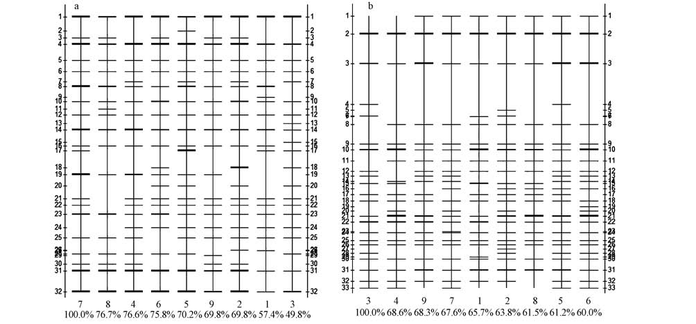 | 图3 大亚湾海域浮游细菌16S rDNA V3区DGGE图谱分析带型图(其中水平轴上的数字(1~9)为站点编号,百分比是与标准泳道的匹配度; 垂直轴上的数字为DNA条带编号(a. 2010年冬,b. 2011年夏)) Fig.3 DGGE pattern analysis of bacterioplankton in Daya Bay(The numbers in the horizon axi(1~9)are station number, and percentages in the horizon axi are similarity of each lane to the st and ard lane. Those in vertical axis are fingerprint numbers(a. 2010 winter; b. 2011 summer)) |