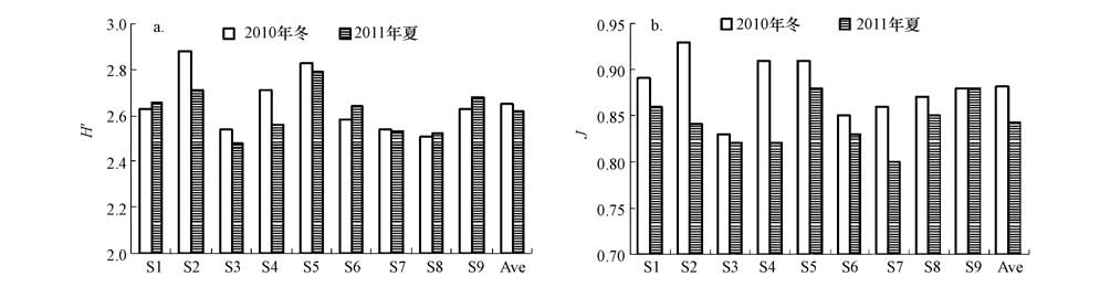 与DNA指纹条带数不同,冬季DNA指纹的Shannon-Weaver多样性指数(H′)略高于夏季(p>0.05),冬季和夏季H′值的变化范围分别为2.51~2.88和2.48~2.79;而均匀度(J)则在冬季明显较高(p<0.01),冬季和夏季分别为0.83~0.93以及0.80~0.88.