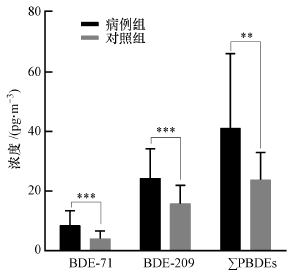 图 2 病例-对照组间PM2.5中PBDEs差异性分析(经统计学检验,与对照组相比,** p<0.01,*** p<0.001) Fig. 2 Difference of PBDEs concentration in PM2.5 between asthma cases and controls |