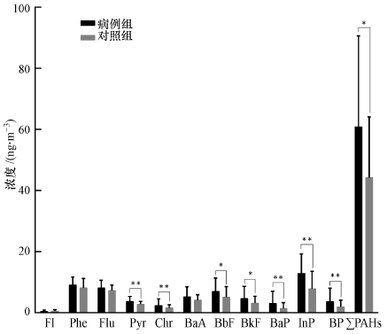 图 3 病例-对照组间PM2.5中PAHs差异性分析(经统计学检验,与对照组相比,*p<0.05,**p<0.01) Fig. 3 Difference of PAHs concentrations in PM2.5 between asthma cases and controls |