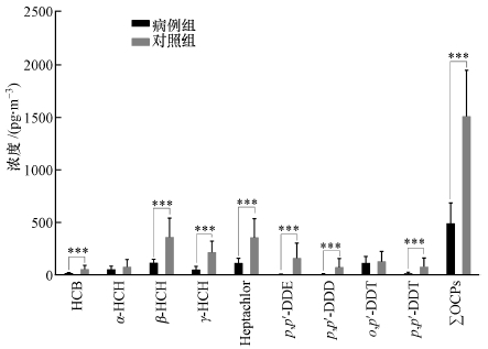 图 4 病例-对照组间PM2.5中OCPs差异性分析(经统计学检验,与对照组相比,***p<0.001) Fig. 4 Difference of OCPs concentrations in PM2.5 between asthma cases and controls |