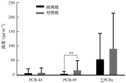 图 5 病例-对照组间PM2.5中PCBs差异性分析(经统计学检验,与对照组相比,**p<0.01) Fig. 5 Difference of PCBs concentrations in PM2.5 between asthma cases and controls |