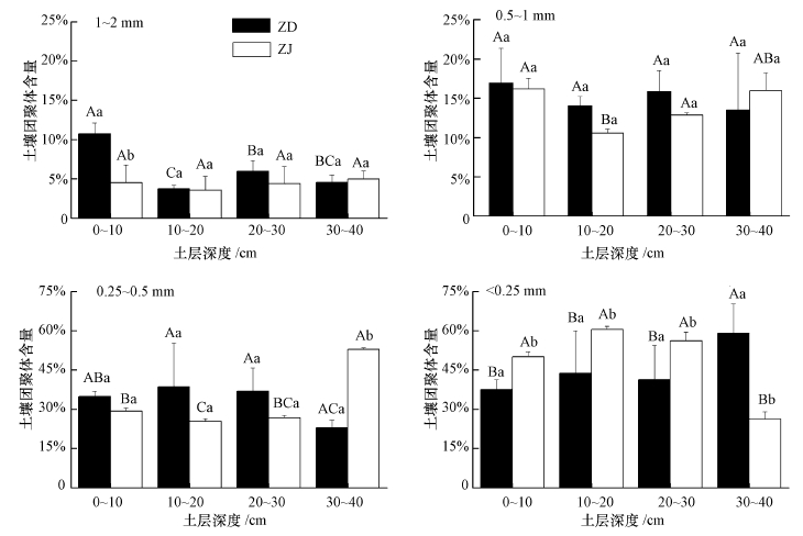 3 结果与分析(Result and analysis) 3.1 秸秆还田对土壤水稳性团聚体数量的影响早稻生长期,对照组(ZD)、实验组(ZJ)中水稳性团聚体均以微团聚体(<0.25 mm粒级团聚体)为主,团聚体粒级越大,含量越少(图 1).秸秆还田后,早稻水稳性大团聚体数量(R0.25)在0~30 cm土层均减少,在30~40 cm土层上升(p<0.05),尤其是0~10 cm土层中1~2 mm水稳性大团聚体数量降低显著(p<0.05),30~40 cm土层中0.25~0.5 mm粒级水稳性团聚体数量上升显著(p<0.05).水稳性微团聚体数量在0~30 cm土层显著升高,在30~40 cm土层显著减少(p<0.05).总体而言,秸秆还田对早稻田水稳性大团聚体和微团聚体含量的影响均不显著.