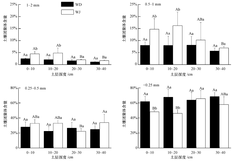 晚稻生长期,对照组(WD)和实验组(WJ)不同土层中水稳性团聚体与早稻情况相同,均以微团聚体为主,团聚体粒级越大含量越少(图 2).秸秆还田后,0~40 cm土层中水稳性大团聚体除了0.25~0.5 mm粒级团聚体在20~30 cm土层稍有下降外,均表现为增加的趋势,特别是>0.5 mm粒级水稳性团聚体数量在0~20 cm土层显著增加(p<0.05).秸秆还田后,水稳性微团聚体含量减少,且在0~20 cm土层减少显著(p<0.05).总体而言,秸秆还田显著增加了晚稻田土壤水稳性大团聚体含量,降低了水稳性微团聚体含量(p<0.05).