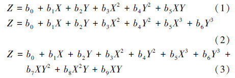 式中,Z为因变量,表示有机酸产量,X和Y为自变量,分别表示C/N比和关键酶活性,bi表示函数中的常数.根据实测数据对以上3种多项式模型进行拟合优度的检验,结果如表 2所示.