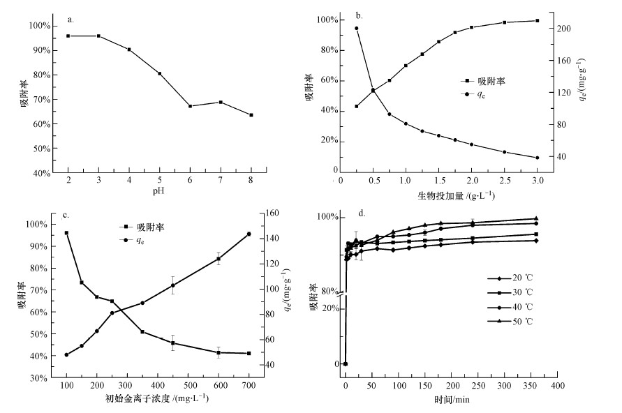 | 图 1 吸附条件对鲍希瓦氏菌吸附Au3+的影响(a.pH,b.生物投加量,c.初始金离子浓度,d.温度) Fig. 1 Effects of physiochemical parameters(a. pH, b. biomass dosage, c. initial Au ions concentration, and d. temperature) on biosorption of Au3+ by S.haliotis |