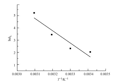 | 图 3 不同温度下Au3+在鲍希瓦氏菌上吸附过程lnkL和1/T的关系 Fig. 3 Plot of lnkL vs 1/T for the biosorption of Au3+ onto S. haliotis at various temperatures |