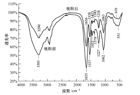 | 图 4 鲍希瓦氏菌吸附前后的FT-IR光谱图 Fig. 4 FT-IR spectra of S.haliotis before and after biosorption |