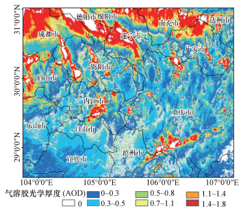 图 1 2014年5月7日四川盆地AOD的空间分布 Fig. 1 Spatial distribution of AOD in Sichuan Basin on 7th May 2014 |