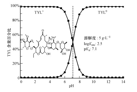 | 图 1 泰乐菌素的分子结构及其在不同pH水溶液中呈现的不同形态 Fig. 1 Structure of tylosin and pH-dependent speciation of tylosin molecular |