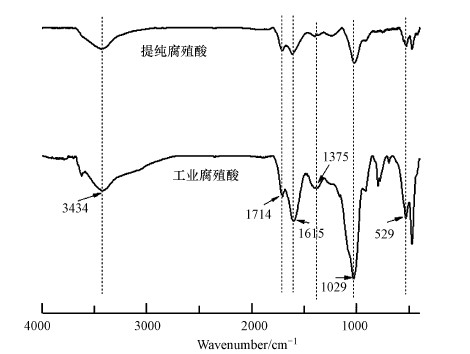 | 图 3 工业腐殖酸提纯前后的红外光谱图 Fig. 3 FTIR spectrum of industrial humic acid before and after purification |