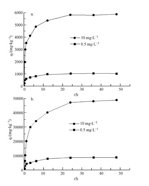 | 图 4 工业腐殖酸(a)和提纯腐殖酸(b)对泰乐菌素的吸附动力学 Fig. 4 Effect of initial concentration on the sorption kinetics of tylosin on industrial humic acid (a) and purification humic acid (b) |