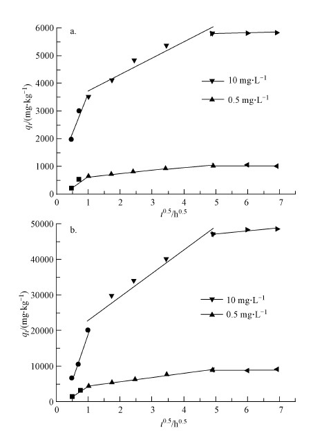 | 图 5 颗粒扩散模型对工业腐殖酸(a)和提纯腐殖酸(b)吸附泰乐菌素的拟合 Fig. 5 Intraparticle diffusion model with different initial concentrations of tylosin on industrial humic acid(a) and purification humic acid(b) |