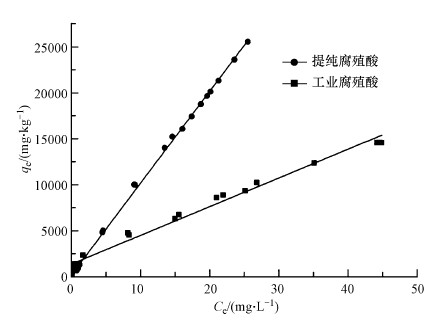 吸附等温线可以描述一定温度下吸附过程达到平衡时溶质分子在两相中浓度之间的关系.提纯腐殖酸和工业腐殖酸样品对泰乐菌素的吸附等温线如图 6所示,吸附的pH值为3.0.吸附等温线分别用线性吸附模型、Freundlich吸附模型及Langmuir吸附模型进行拟合,拟合结果见表 3.