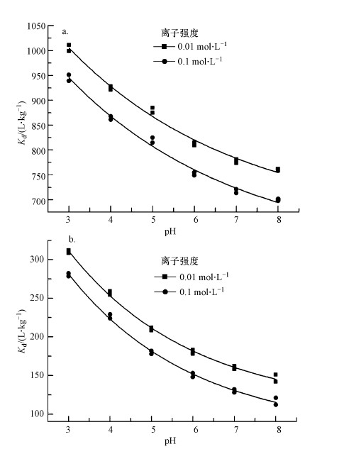 | 图 7 pH和离子强度对提纯腐殖酸(a)和工业腐殖酸(b)吸附泰乐菌素的影响 Fig. 7 Effects of ionic strength and pH on the sorption of tylosin on purification humic acid (a) and industrial humic acid (b) |