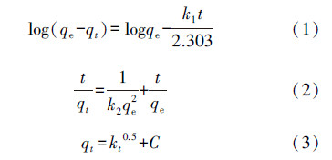 2.4 吸附模型吸附动力学分别用拉格朗日一级动力学方程、拉格朗日二级动力学方程和颗粒间扩散模型进行拟合,其表达式分别如公式(1)、(2)和(3)所示(Guo et al.,2015).