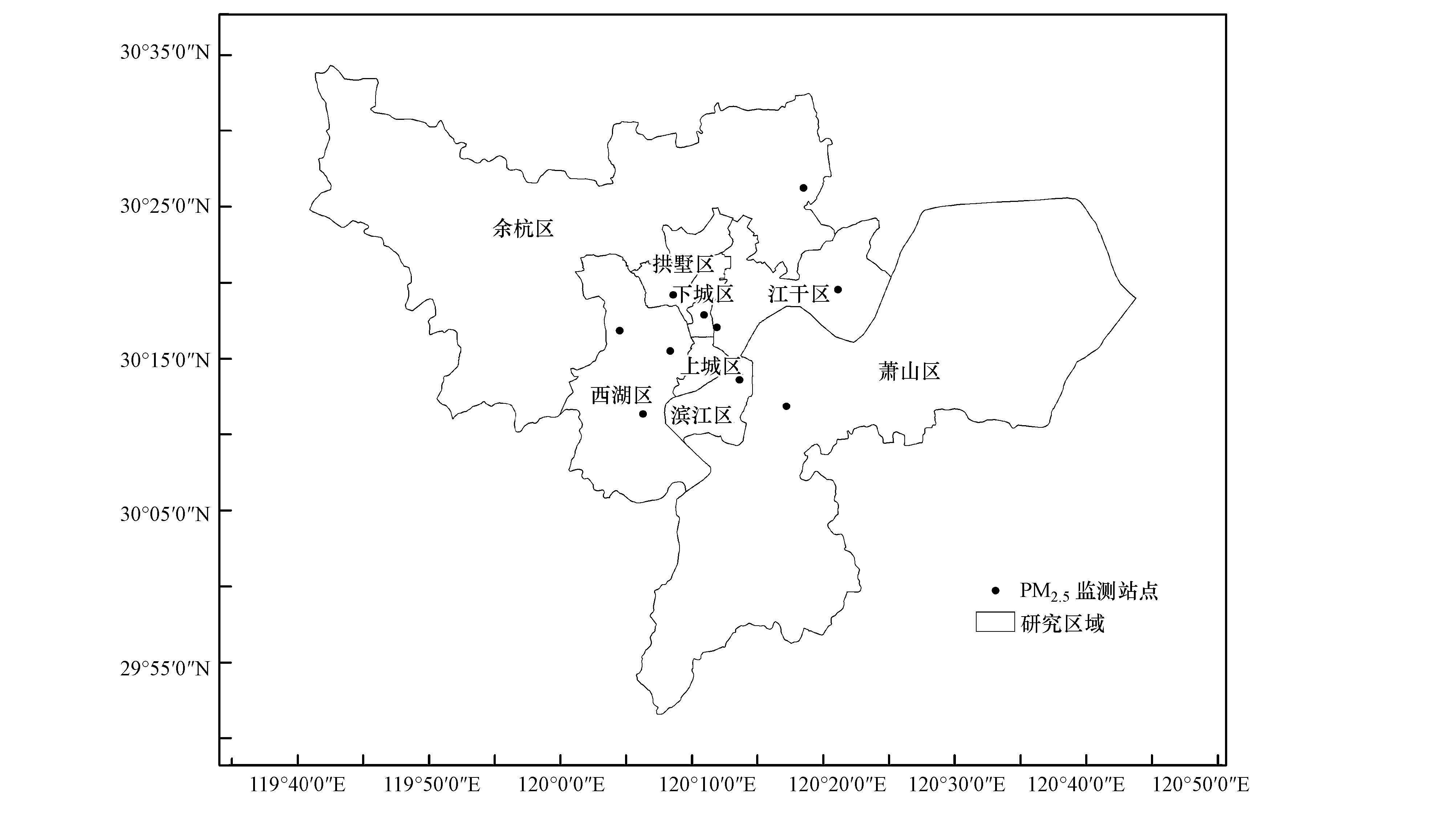 杭州地处长江三角洲南翼.近年来,工业发展迅速的同时伴有污染物大量排放,加之杭州特有的环境气象条件,使得杭州地区细颗粒物污染日益加重(齐冰等,2015),有限的地基监测站点无法涵盖这个城市地区,无法准确解释细颗粒物污染的空间分布特征.因此,建立土地利用回归模型模拟杭州地区PM2.5浓度空间分布意义重大.