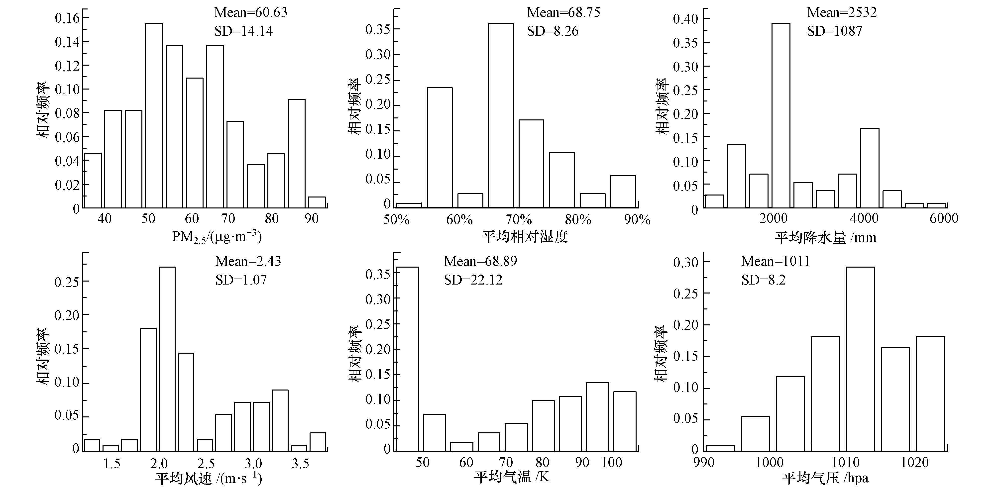 3 模型方法与模型评价(Model and evaluation) 3.1 部分建模数据统计特征描述气象要素的变化对污染物的扩散、转化、沉降都有着巨大的影响(翟广宇等,2015).在建模前,对PM2.5浓度值和气象因子进行了简要的描述和分析.图 2是建模中各参数的频率分布直方图.PM2.5的最小值是34.64 μg·m-3,最大值是93.4 μg·m-3均值是 60.63 μgg·m-3,高值出现在春冬季节的概率很大.平均相对湿度最小值是53.42%,最大值86.99%,均值是74%.平均降水量均值是2489 mm,最大值是5824.05 mm,最小值是224.3 mm,这表明杭州地区为湿润的气候特征.