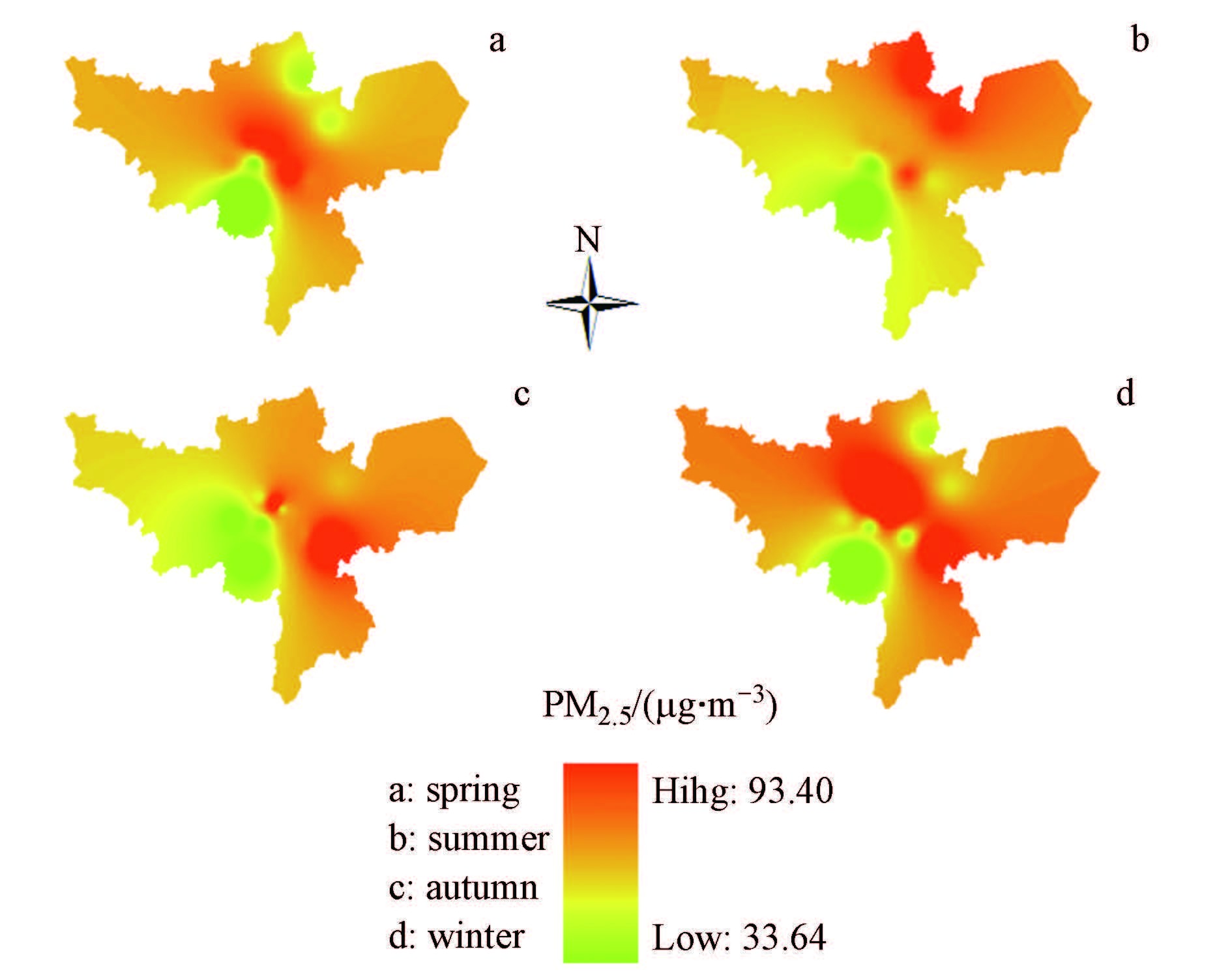 | 图 4 基于GWR模型各季度 PM2.5浓度空间模拟分布 Fig. 4 Spatial distribution of seasonal PM2.5 concentrations for the GWR model |