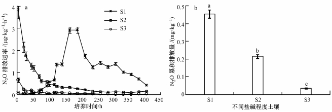 | 图 1 无外源盐不同盐渍化程度土壤N2O排放速率(a)和N2O累积排放量(b)(标准差棒上的不同小写字母表示不同土壤类型存在显著差异性) Fig. 1 N2O emission rate(a) and N2O cumulative emission(b) from soil of different salinizationevels without external salt |
