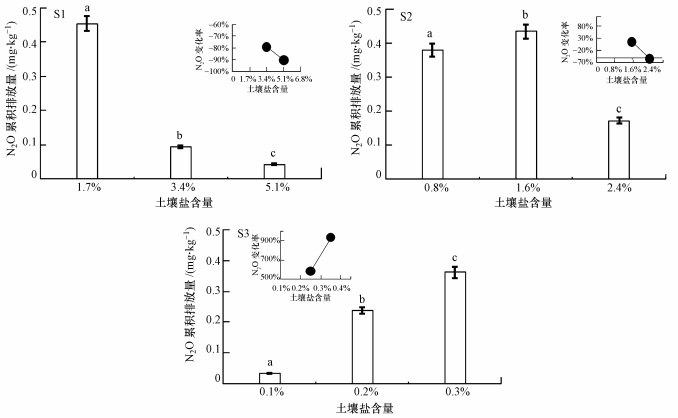 | 图 3 不同浓度盐分加入不同盐碱程度土壤的N2O累积排放量(N2O变化率为盐含量3.4%和5.1%的S1土壤N2O排放量与无外源盐S1土壤相比较, N2O的变化,其余类似; 标准差棒上的不同小写字母表示不同土壤类型存在显著差异性) Fig. 3 N2O cumulative emissions of soil of different salinization levels with addition of different concentrations of salt |
