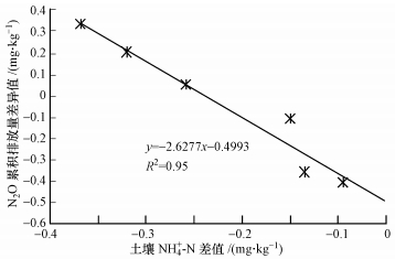 | 图 4 土壤加入外源盐后N2O累积排放变化量与土壤铵态氮含量差值的关系 Fig. 4 Relationship between the variation of N2O accumulation and the difference of soil ammonium nitrogen content in soil with addition of different concentrations of external salt |