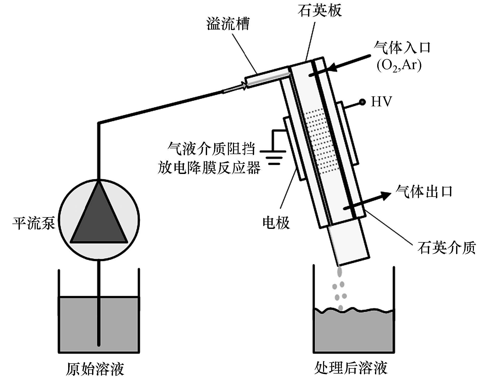 2 材料与方法(Materials and methods) 2.1 实验装置与材料实验采用本课题组开发的气液介质阻挡放电降膜反应器,反应器由溢流槽、石英板、石英介质和电极组成,具体如图 1所示.其中,石英板位于反应器中间,用于连接溢流槽和位于其两侧的石英介质,同时起到密封反应器的作用.电极材料采用铁丝网电极.实验中溶液经平流泵(2PB-1040,北京卫星制造厂)以不同的液体流量输入至反应器的溢流槽中,然后以很薄的液膜形式紧贴放电反应器一侧的石英介质向下流动,最终从反应器末端的出口管流出并被收集分析.实验用气体是纯度为99.999%的氧气和99.99%的氩气.在常压下,放电反应器由一个交流高压电源(CTP-2000P,南京苏曼电子有限公司)激发,在液膜表面上方形成均匀稳定的介质阻挡放电状态,放电间距为6 mm.液膜在放电反应器内的停留时间由液体流量控制,液膜的厚度约为100 μm.