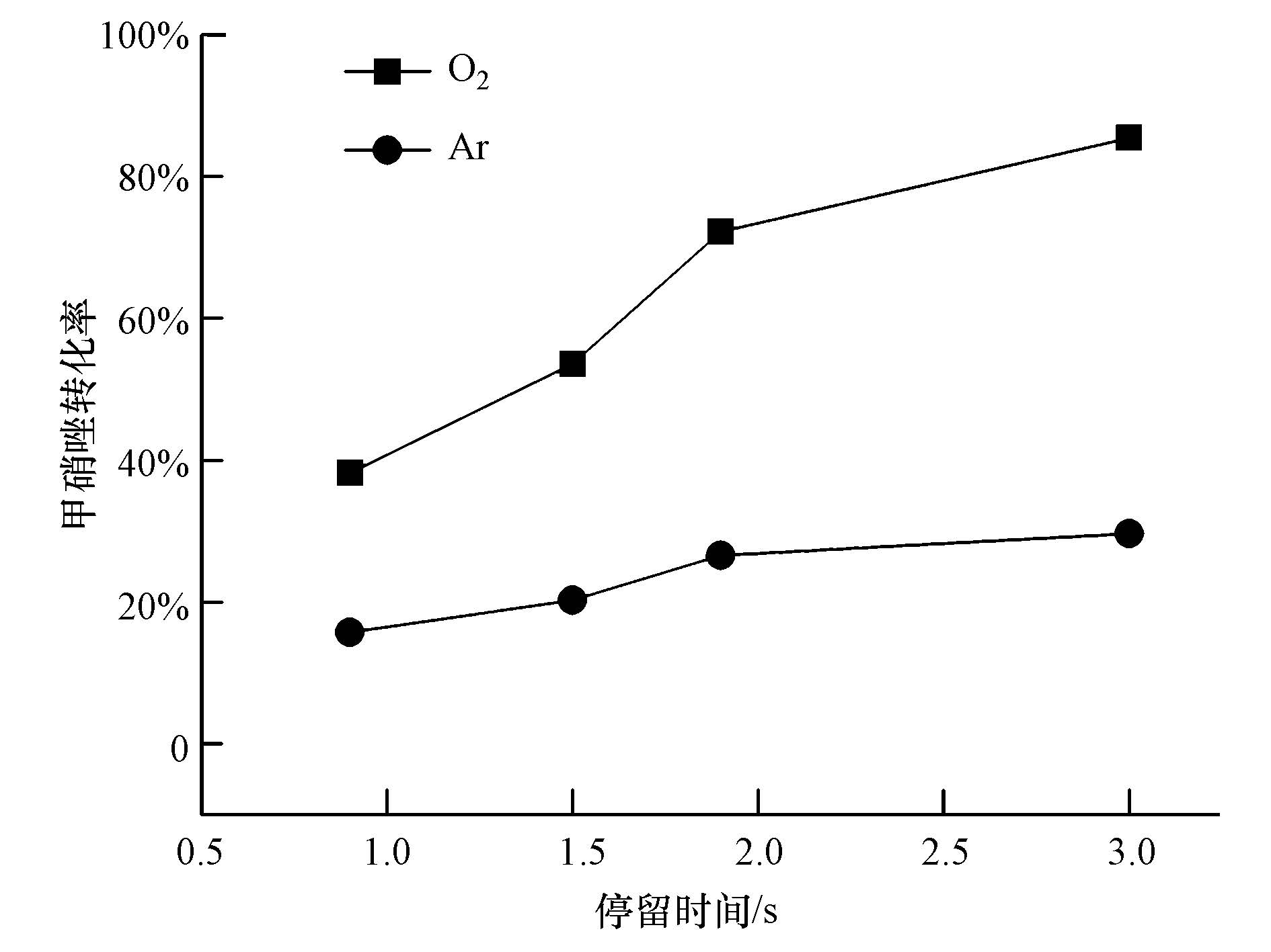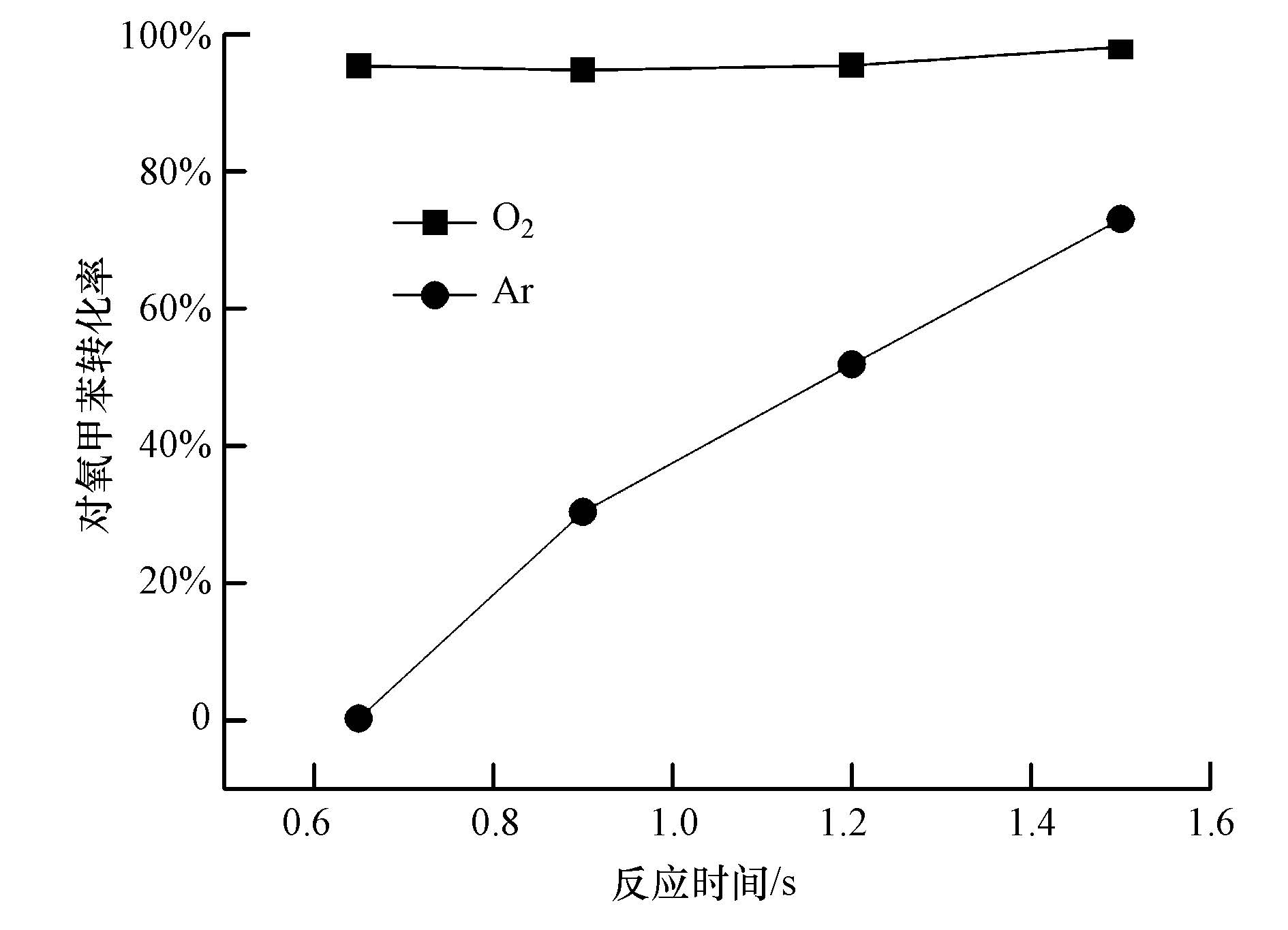3 结果与讨论(Results and discussion) 3.1 ·OH的定量分析与评价本文采用羟基捕捉剂-高效液相色谱法定量测量·OH的量,选用对氯苯甲酸(4CBA)作为探针化合物(王海燕等,2008).对氯苯甲酸与·OH的反应速率常数高达5×109 L·mol-1·s-1,而与臭氧具有非常低的反应速率(≤0.15 L·mol-1·s-1).对氯苯甲酸可以通过高效液相色谱轻易地检测到,证据更直观,而且可以根据对氯苯甲酸与·OH的二级反应速率常数计算出·OH的稳态浓度(Elovitz et al.,1999; Gupta et al.,2007).图 2给出了分别在氧气和氩气等离子体放电气氛下,初始浓度为3 mg·L-1的对氯苯甲酸在不同停留时间下的降解结果.可以看出,在氧气放电气氛下,当液膜的停留时间为0.65 s时,对氯苯甲酸的转化率已接近100%,说明此时溶液中的对氯苯甲酸基本已被·OH完全降解.而在氩气气氛放电条件下,当液膜的停留时间为0.65 s时,对氯苯甲酸的转化率基本为0;继续增大停留时间,对氯苯甲酸的转化率随之增大,当停留时间增大到1.5 s 时,对氯苯甲酸的转化率达到73%;若继续增大停留时间,对氯苯甲酸与·OH充分反应,最终会被降解完全.同时从图 2可以看出,氧气气氛下对氯苯甲酸的转化率远高于氩气气氛下,这就表明在该气液DBD降膜反应器内,氧气气氛下产生的羟基自由基浓度要远高于氩气气氛下.