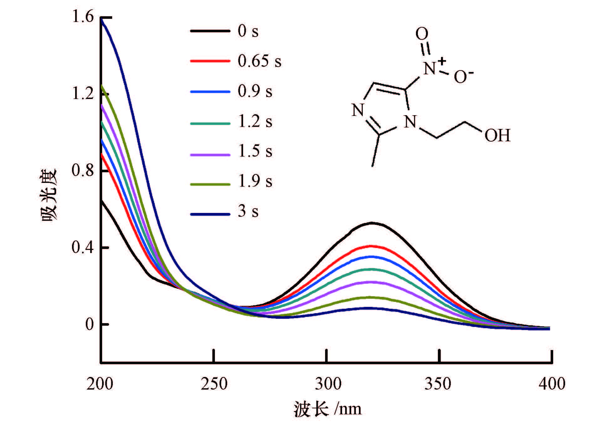 图 4给出了甲硝唑溶液在不同停留时间作用下的紫外-可见光谱图.由图中可以看出,甲硝唑溶液在318 nm处的最大吸收峰强度随着停留时间的增大而逐渐减弱,说明甲硝唑的分子结构在降解过程中被逐步破坏,甲硝唑的浓度在逐渐降低.值得一提的是,甲硝唑溶液在220 nm附近的强度随着停留时间的增大而逐渐增大,这就表明甲硝唑分子结构中的硝基和含氮键被破坏生成了硝酸根(Perez et al.,2015).