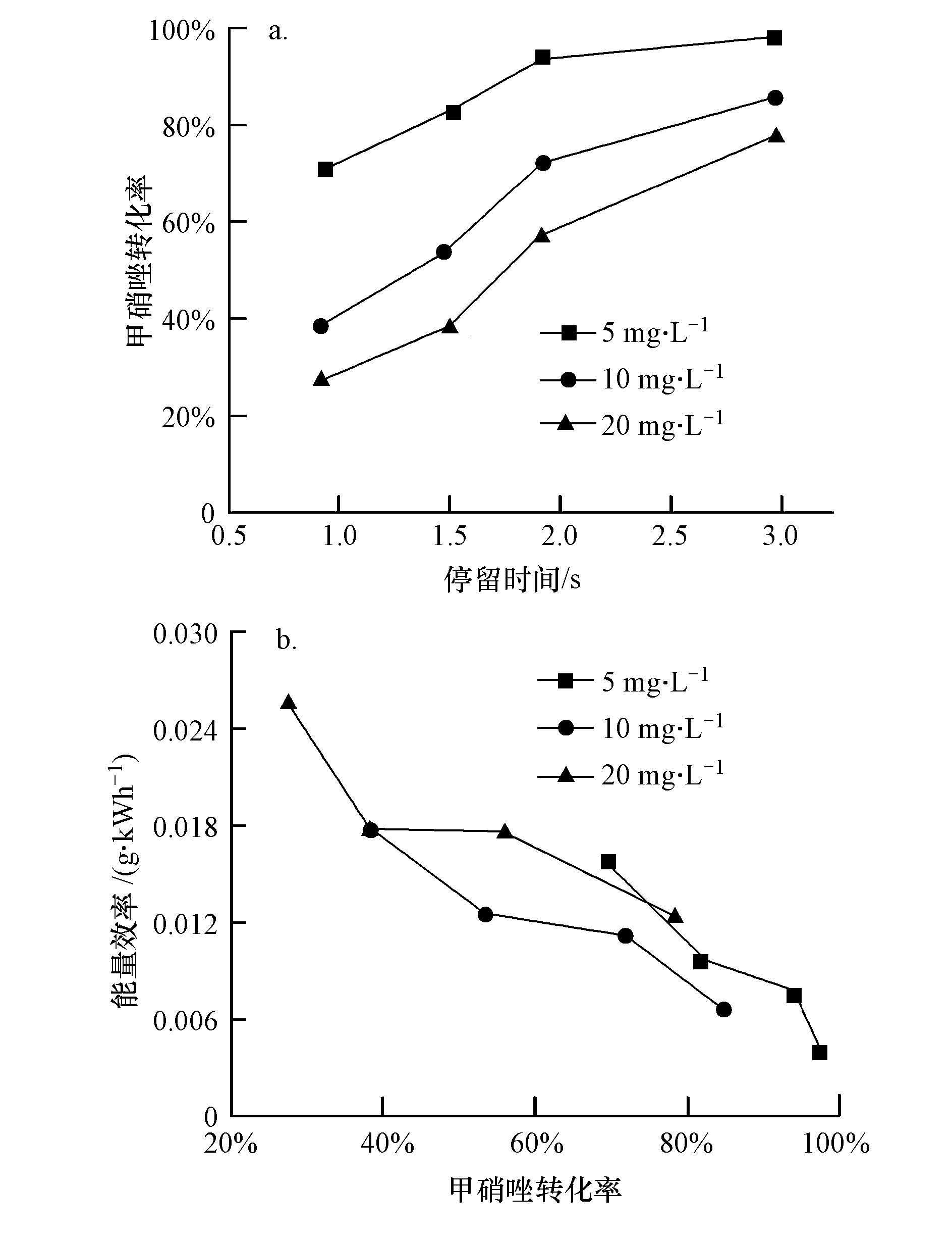 对不同初始浓度的甲硝唑溶液进行降解效果考察,如图 5a所示,甲硝唑的转化率均随着停留时间的增大而增大,同时甲硝唑的初始浓度越小,其转化率越大.当停留时间为3 s时,初始浓度为5、10、20 mg·L-1的甲硝唑溶液的转化率分别为97.8%、85.4%和78.7%. 对甲硝唑降解过程的能量效率进行考察,如图 5b所示,甲硝唑降解的能量效率随着其转化率的增大而呈现下降的趋势.因此,实际过程中需要综合考虑甲硝唑转化率和能量效率的共同目标,从而针对不同的甲硝唑初始浓度选择合适的反应器停留时间操作条件.