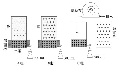 实验装置由3个土壤柱及一个蠕动泵组成.土壤柱高1.5 m, 直径0.2 m, 由不锈钢制成, 内装有400 g风干土壤, 底部有溢流口及控制开关, 溢流口处塞有脱脂棉, 防止土壤溢出, 柱外壁包裹1.5 cm的保温层, 以缓冲外界温度变化对土壤的影响.3个土壤柱分别命名为A柱、B柱及C柱, 实验装置如图 1所示.在A柱土壤上方放置1.7 kg超纯水冷冻而成的冰柱, B柱土壤上方放置1.7 kg积雪, C柱顶端与蠕动泵出水口连接, 蠕动泵进水口与装有1.7 L融雪水(即取1.7 kg积雪置于室内, 待完全融化成雪水后, 装入塑料瓶中)的容器连接.A柱及B柱白天早7:00至17:00置于室内, 室内温度约为15 ℃, 其余时间置于-15 ℃的冰箱内.C柱置于室内, 早7:00打开蠕动泵, 17:00关闭, 设置蠕动泵流速为25 mL·h-1.在溢流口处接取滤液, 每300 mL收集一次, 每柱收集5次, 分别命名为A1~A5、B1~B5、C1~C5.将收集好的淋滤液过0.45 μm滤膜后, 置于4 ℃冰箱保存.实验装置如图 1所示.