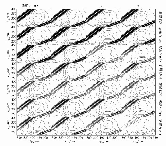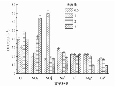 1) 随着Na+、Mg2+和Ca2+溶液浓度的升高, 土壤浸提液中DOC浓度显著降低;随着Cl-、SO42-、Mg2+、Ca2+溶液浓度的升高, UV-254值逐渐减小;随着Na+、Mg2+浓度的升高, SUVA值逐渐升高.NO3-、SO42-及Na+的浓度过高或过低时, 土壤浸提液中DOM的类腐殖酸及类富里酸荧光峰强度较低;随着Cl-、Mg2+和Ca2+浓度的升高, 土壤浸提液中DOM类腐殖酸荧光峰强度逐渐降低.