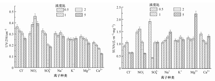 UV-254是指在波长为254 nm处的单位比色皿光程下的紫外吸光度, 其值能够反映所测样品中腐殖质类大分子有机物及含C=C和C=O双键的芳香族化合物的多少(Leenheer et al., 2003).UV-254/DOC, 即单位溶解性有机碳的紫外吸收值SUVA (L·m-1·mg-1), 它可以反映水中有机物的芳香构造化程度, 简称芳香度(Reckhow et al., 1990).SUVA还可以反映出水中有机物的某些特性, 如芳香性及不饱和双键或芳香环有机物相对含量的多少等(Leenheer et al., 2003).Nishijima等(2004)认为, 有机物在254 nm下的紫外吸收主要代表包括芳香族化合物在内的具有不饱和碳碳键的化合物, 相同DOC浓度的有机质在该波长下吸光值的增加意味着非腐殖质向腐殖质的转化.不同离子在不同浓度下浸提土壤, 浸提液中UV-254及SUVA值如图 3所示.随着Cl-、SO42-、Mg2+、Ca2+浓度的升高, 土壤浸提液中的UV-254值逐渐降低, 说明这几种离子对土壤中芳香性化合物的解吸具有抑制作用.随着NO3-浓度的升高, 土壤浸提液中的UV-254逐渐增高, SUVA值逐渐降低, 说明高浓度的NO3-更容易将土壤中非芳香性化合物解吸出来, 因而导致浸提液中芳香性化合物相对含量的降低.随着Na+浓度的升高, SUVA值逐渐升高, 由1.05 L·m-1·mg-1升高至1.48 L·m-1·mg-1, 而DOC含量逐渐降低(图 2), 说明高浓度的钠盐能抑制DOM从土壤中的释放, 并且对非芳香性化合物的抑制作用更强, 导致浸提液中芳香性化合物相对含量的升高.其他离子浓度变化对芳香性物质从土壤中的释放影响不明显.