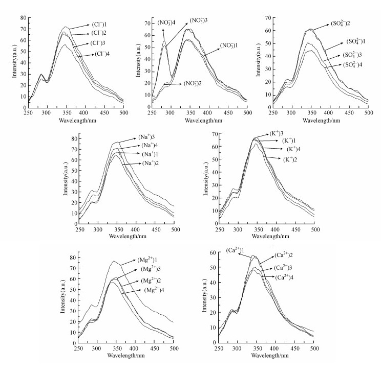 从图 5可以看出, 各样品同步荧光谱图中有两个显著荧光峰Ⅰ(λsyn=280~300 nm)和峰Ⅱ(λsyn=330~350 nm), 与三维荧光谱图对比可知, 峰Ⅰ位于类溶解性微生物代谢产物荧光区, Alberts等(2004)认为该峰表示的是芳香性氨基酸(色氨酸、酪氨酸和苯丙氨酸)类物质及含有芳香性氨基酸的蛋白质.峰Ⅱ位于类腐殖酸荧光区, 从图 5可以看出, 各样品同步荧光谱图中该峰为主要荧光峰, 这与三维荧光谱图中所反映的类腐殖酸荧光物质为主要荧光物质一致.随着Cl-、Mg2+、Ca2+浓度的升高, 类腐殖酸荧光峰强度逐渐降低.硝酸根浓度升高至2倍, 类溶解性微生物代谢产物荧光峰突然增高, 当硝酸根浓度升至5倍时, 达到最高, 这说明高浓度的硝酸根离子能促进微生物的代谢活性, 从而导致类溶解性微生物代谢产物的增多, 其荧光峰强度的增大.这与上述三维荧光分析中所得氮沉降能促使有机质分解的结论相一致.