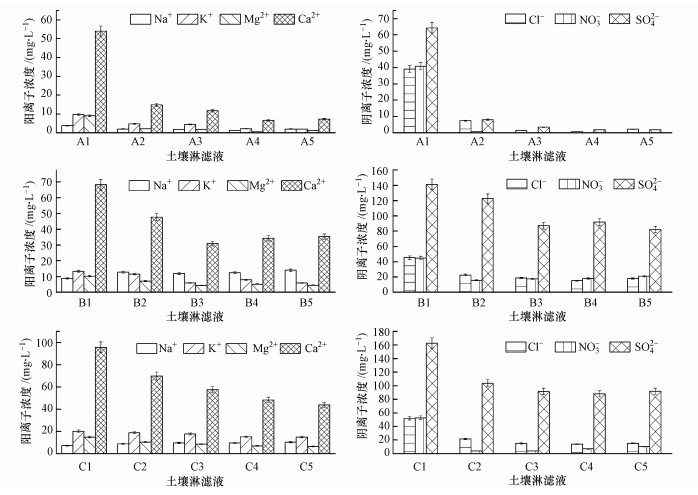 在不同化学特征的积雪融化条件下土壤淋滤液中化学离子的浓度变化如图 6所示.可以看出, 在3个土柱接口处依次接取的5个淋滤液中, Na+浓度最平稳, 其浓度变化幅度不大;K+和Mg2+浓度略微有降低的趋势;Ca2+降低幅度最大, 与A5相比, B5、C5中Ca2+浓度较高, 这是由于雪中含有浓度相对较高的Ca2+, 而A柱进水为超纯水(不含Ca2+), 导致土壤淋滤液中Ca2+相差较大.A柱中各样品中各离子浓度与B、C柱相比均较低.3个土壤柱中, 阴离子浓度降低幅度较为明显, 总体来看, B、C柱中SO42-浓度明显高于A柱.同时可以发现, A柱与B、C柱相比, 第2次接取淋滤液的离子浓度与第1次相比降低较为明显, 如图所示, 从A1至A2 Ca2+浓度由54 mg·L-1降低至14 mg·L-1, 降低了74.1%.在第2次接取淋滤液中离子浓度出现了骤减现象, 之后几次的接取液中离子浓度变化不大.而B、C柱离子浓度降低幅度相对较平缓, B1至B2 Ca2+浓度由68 mg·L-1降低至47 mg·L-1, 降低幅度为30.8%;C1至C2 Ca2+浓度由95 mg·L-1降低至69 mg·L-1, 降低幅度为27.3%.以Ca2+、Cl-、NO3-和SO42-浓度变化趋势表现较为显著.