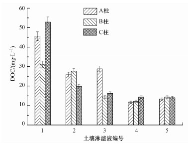 图 7表示的是土壤分别在A冰柱、B雪柱及C雪水的淋溶下, 土壤DOC含量的变化规律.3个土柱所接取滤液分别依次由1标记至5.可以看出, 各柱淋溶液中DOC含量逐渐减少, 这是由于DOC含量与降水量呈负相关关系, 降水不断稀释土壤中的DOC造成的(黄黎英等, 2007).A5、B5和C5中DOC含量分别为13.3、16.31、13.99 mg·L-1, 其含量大体一致, 然而A1、B1及C1中DOC含量分别为45.56、31.2、52.84 mg·L-1, 其含量相差甚远.将雪柱B白天置于室内时, 上层积雪逐渐融化, 由于淋溶作用导致积雪初始淋溶液中离子浓度较高, 阳离子浓度相应也较高, 因而B1中阳离子浓度明显高于A1及C1, 由于DOC中很大一部分为酸性组分, 因而很容易与其他物质如钙镁化合物发生絮凝沉淀, 所以, 较高离子强度的溶液浸提下土壤中DOC含量低于低离子强度的土壤浸提液中DOC的含量.C1中DOC含量高于A1、B1, 这可能是由于C雪水柱中含有适量阴阳离子, 当雪水流经土壤时, 土壤表面与DOC之间的静电斥力降低, DOC颗粒间相互吸引团聚的机会减弱, 稳定性增强, 从而导致适量的离子浓度下, DOC含量高于不含离子的A柱淋溶液.根据胡俊栋等(2009)的研究, 离子强度的减小会促进土壤胶体的稳定和释放;相反地, 离子强度增大会抑制土壤胶体的稳定和释放, 这一理论与本实验结果相符.随着B柱积雪不断融化, 积雪融水中的离子浓度显著减少, 故在第4、5次接取的淋滤液中DOC含量与A柱和C柱DOC含量相接近.