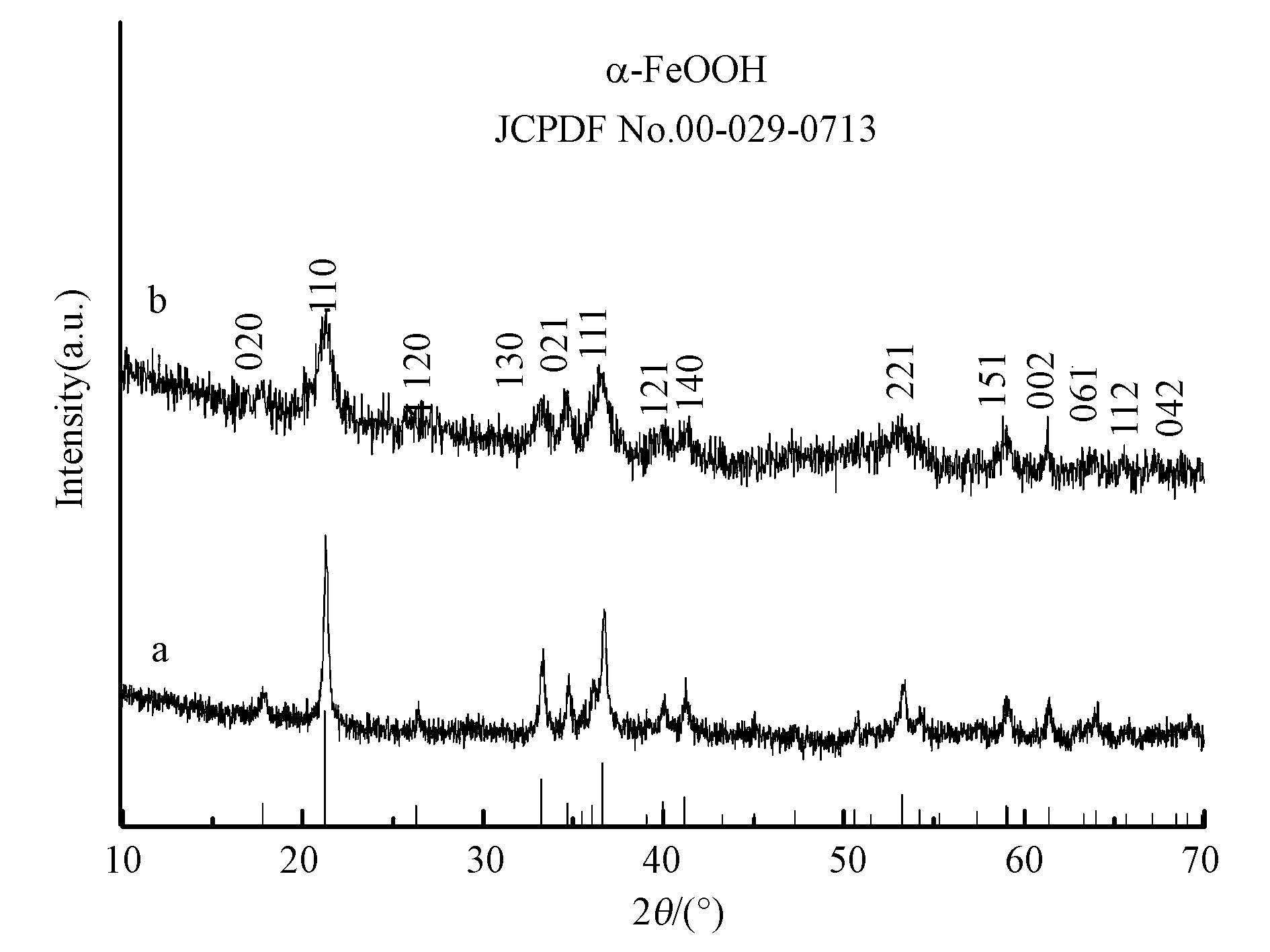 | 图 1 催化剂α-FeOOH(a)和α-(Fe,Cu)OOH(b)的XRD图 Fig. 1 XRD patterns of α-FeOOH(a)and α-(Fe,Cu)OOH(b) |