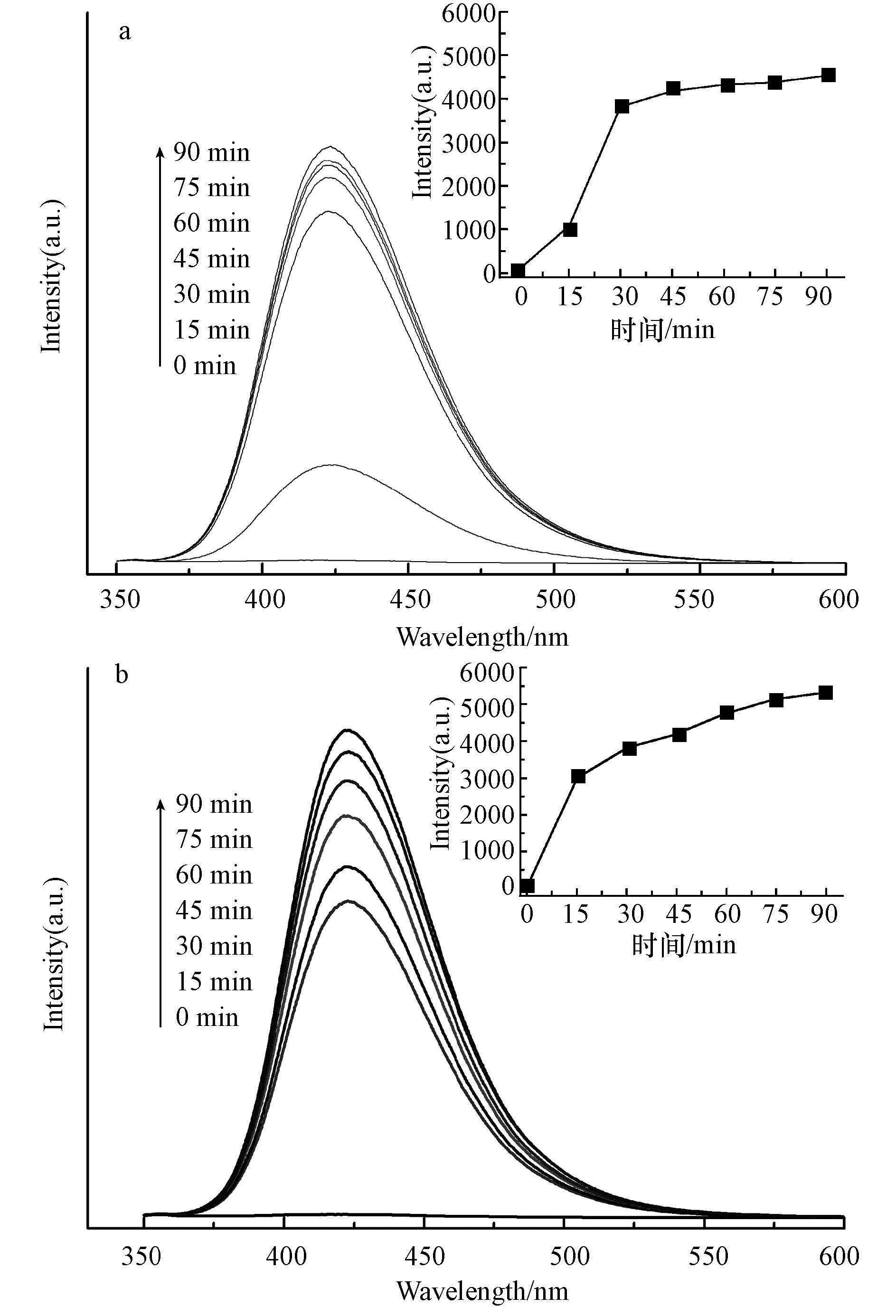 | 图 12 可见光助α-FeOOH/H2O2(a)和可见光助α-(Fe,Cu)OOH/H2O2(b)的·OH荧光光谱图和荧光信号强度变化图 Fig. 12 Fluorescence spectra of ·OH and fluorescence signal intensity variation ofvisible light/α-FeOOH/H2O2(a)and visible light/α-(Fe,Cu)OOH/H2O2(b)(the insets are the dependence of the fluorescence signal intensities(425 nm)against light illumination time for 2-hydroxy terephthalic acid) |