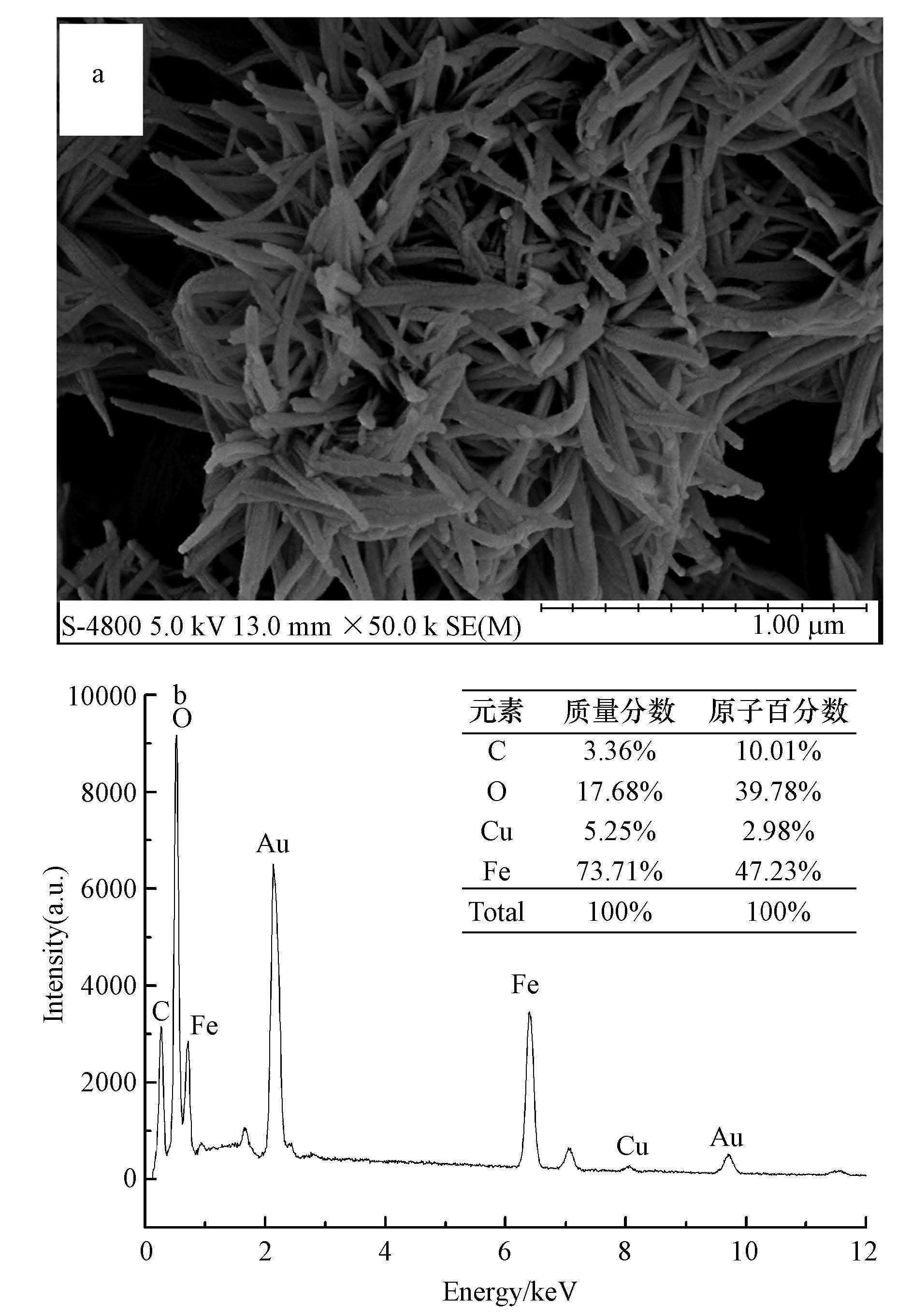 | 图 2 催化剂α-(Fe,Cu)OOH的SEM图(a)和EDX图(b) Fig. 2 SEM image(a)and EDX spectrum(b)of α-(Fe,Cu)OOH |