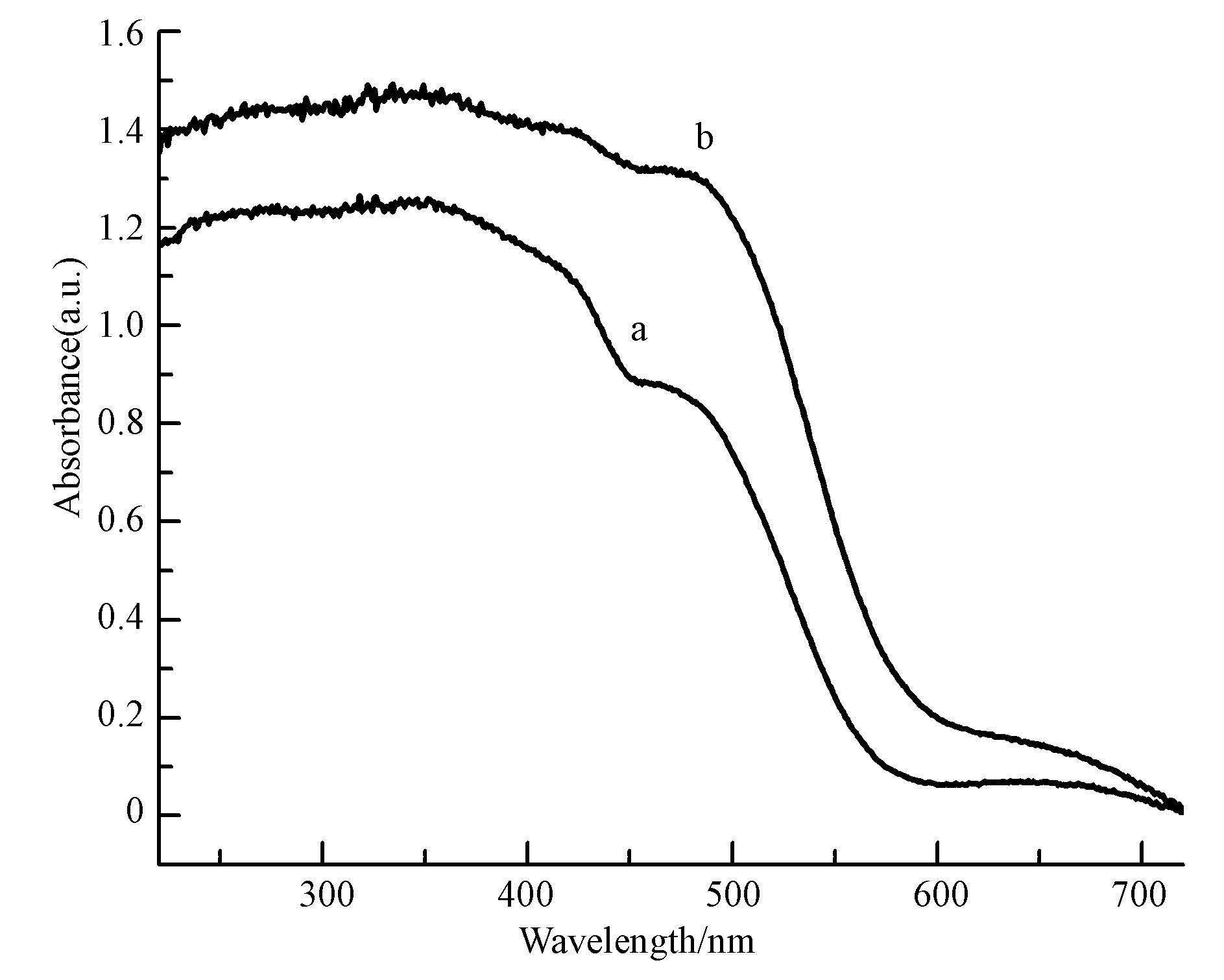 | 图 4 α-FeOOH(a)和α-(Fe,Cu)OOH(b)的紫外-可见漫反射图 Fig. 4 UV-Vis DRS spectra of α-FeOOH(a)and α-(Fe,Cu)OOH(b) |