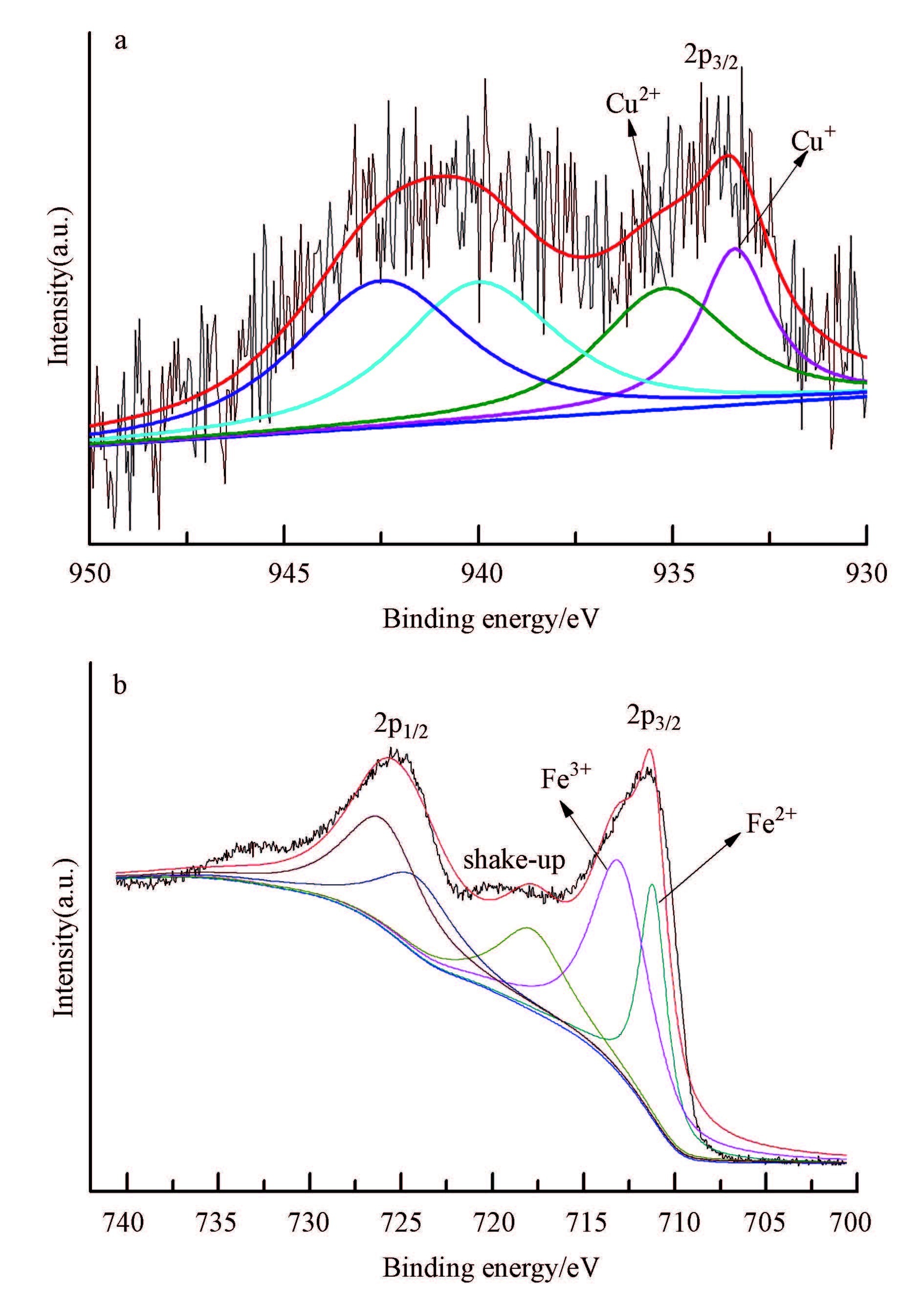 | 图 5 催化剂α-(Fe,Cu)OOH的XPS图谱(a.Cu 2p,b.Fe 2p) Fig. 5 XPS spectra of α-(Fe,Cu)OOH(a.Cu 2p,b.Fe 2p) |