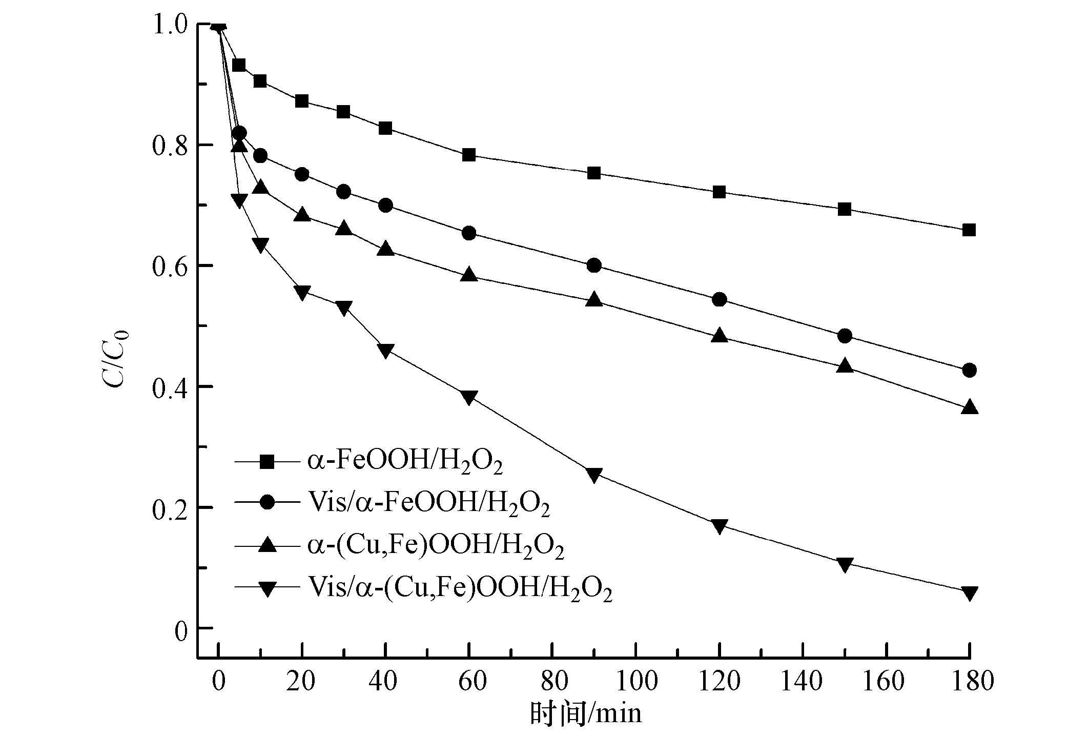 为考察α-(Fe,Cu)OOH在光助异相Fenton体系中的催化效能,在催化剂投加量为0.40 g·L-1,H2O2浓度为0.10 mol·L-1时,对比不同反应体系对CIP的去除效果,结果如图 7所示.由图 7可知,α-FeOOH/H2O2体系对CIP的去除效率仅为30%,α-(Fe,Cu)OOH/H2O2体系对CIP的去除效率为60%,光助α-FeOOH/H2O2体系对CIP的去除效率为58%;光助α-(Fe,Cu)OOH/H2O2体系对CIP的去除率可达90%以上.结果表明,Cu掺杂提高了α-FeOOH的催化活性,使得α-(Fe,Cu)OOH/H2O2和光助α-(Fe,Cu)OOH/H2O2体系对CIP去除效率分别明显高于α-FeOOH/H2O2和光助α-FeOOH/H2O2体系.
