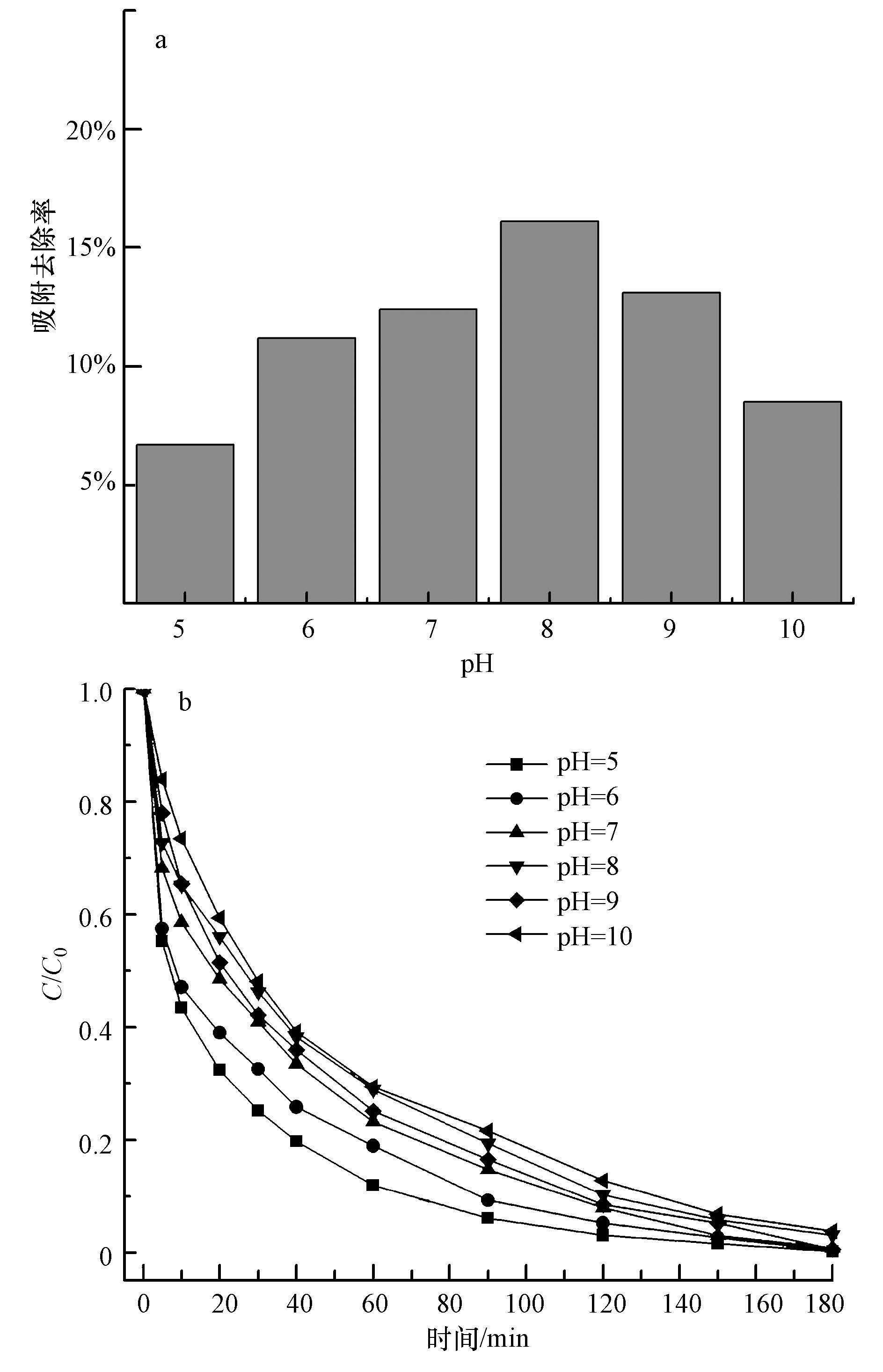 | 图 8 pH值对CIP吸附(a)和降解(b)的影响 Fig. 8 Effects on CIP adsorption(a)and catalytic degradation(b)at different initial pH of solution |