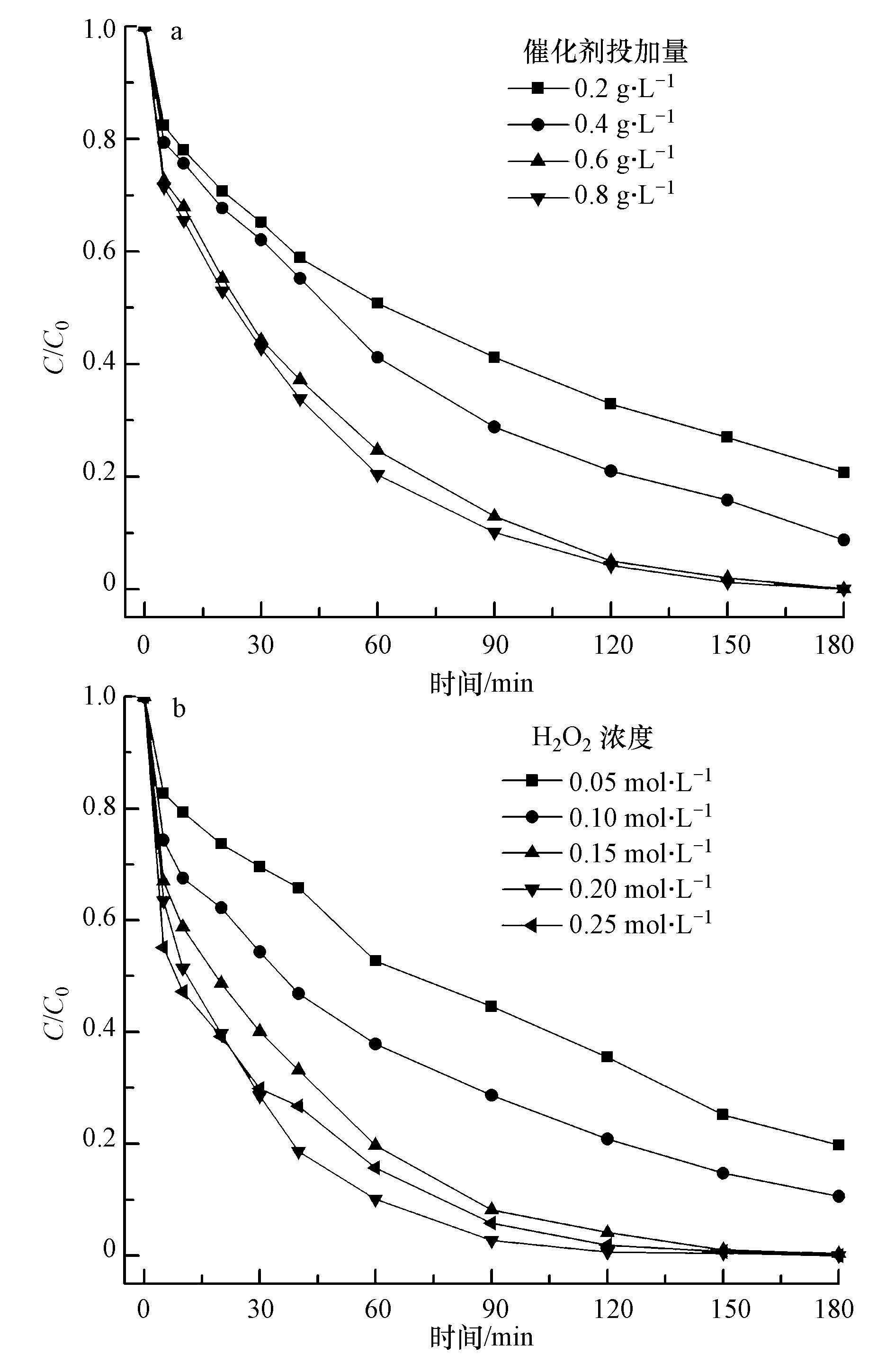 | 图 9 催化剂加量(a)和H2O2浓度(b)对CIP去除率的影响 Fig. 9 Effects on the removal of CIP at different catalyst dosages(a)and different H2O2 concentrations(b) |