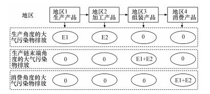 生产链末端视角的大气污染排放, 即将一个产品生产过程中产生的所有排放, 分配给完成生产环节的地区, 在本例中, 产品最后一个环节为组装, 发生在地区3, 因此地区3的生产链末端视角的排放为E1+E2.这种视角的清单有利于促使位于生产链末端的地区选用较为清洁、环保的原材料和半成品, 促进国际间的合作减排 (Liang et al., 2015).