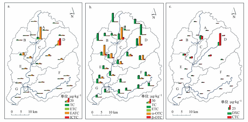 | 图 2 各子流域土壤中TCs浓度分布 (a.TC及其降解产物浓度, b.OTC及其降解产物浓度, c.DXC及CTC浓度) Fig. 2 TCs concentration in soil in each sub-basin (a. Tetracycline and its degradation derivatives concentrations, b. Oxytetracycline and its degradation derivatives concentrations, c. Doxycycline and Chlotetracycline concentrations) |