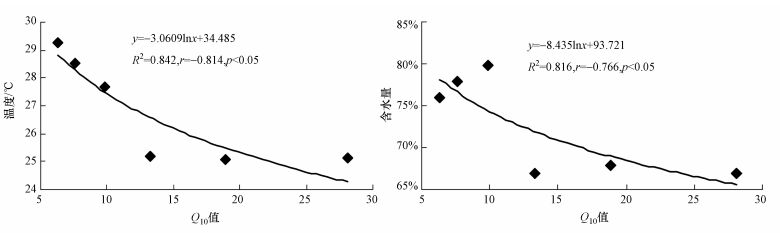 温度、含水量等环境因子与Q10值关系密切.Q10值与温度和含水量的变化趋势基本一致,均随温度和含水量的增加而减小.由图 3可知,温度与Q10值具有显著的负相关关系(r=-0.814,p<0.05),含水量与Q10值也具有显著的负相关关系(r=-0.766,p<0.05),和含水量相比,温度与Q10值的关系更加密切.